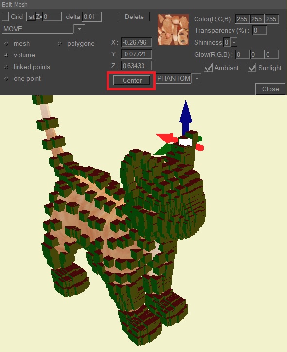 A2. click on a point of the mesh, click on the CENTER button.